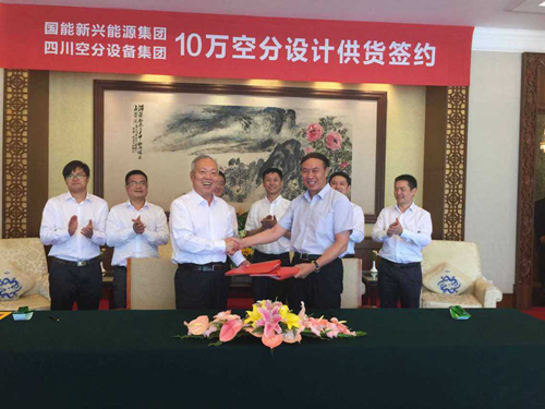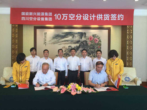 2015年7月22日12時28分,四川空分設(shè)備(集團)有限責(zé)任公司與國能新興能源集團10萬空分設(shè)計供貨合同簽約儀式在北京釣魚臺國賓館成功舉行。出席簽約儀式的有國能新興能源集團公司董事長王光明先生、四川空分設(shè)備(集團)有限責(zé)任公司董事長單金銘先生、副總經(jīng)理李成旭先生、謝波先生等,以及國能新興能源集團公司副總經(jīng)理宋笠華先生、韓丹丹女士。