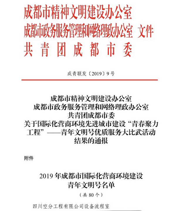 公司團(tuán)委推報的四川空分集團(tuán)工程有限公司設(shè)備流程室青年文明號響應(yīng)活動號召,結(jié)合自身實際積極開展創(chuàng)建的各項活動。自2018年8月開始,經(jīng)過預(yù)賽推報的層層考核,成功進(jìn)入復(fù)賽。2019年6月25日同所有參加單位一起現(xiàn)場逐一進(jìn)行了復(fù)賽答辯評審。此后,參與了為期15天的網(wǎng)上投票,得到了公司領(lǐng)導(dǎo)及廣大員工的全力支持。最終經(jīng)過組委會的綜合評分等環(huán)節(jié),四川空分集團(tuán)工程公司設(shè)備流程室青年文明號在眾多參選集體中脫穎而出成功進(jìn)入最終獲獎名單。