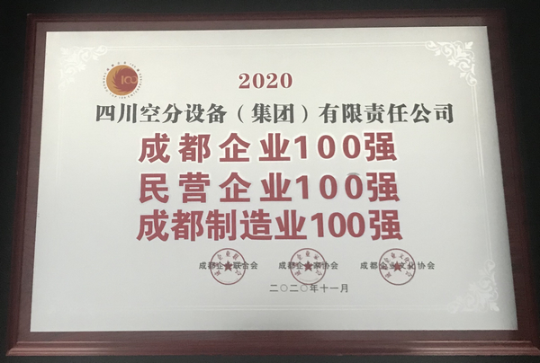 近日,我公司榮獲2020年度“成都百?gòu)?qiáng)企業(yè)”“成都民營(yíng)百?gòu)?qiáng)企業(yè)”“成都制造業(yè)百?gòu)?qiáng)企業(yè)”以及“2020成都5+5+1重點(diǎn)產(chǎn)業(yè)領(lǐng)軍企業(yè)(裝備制造)10強(qiáng)”等榮譽(yù)稱(chēng)號(hào)。這代表著客戶、行業(yè)和社會(huì)對(duì)四川空分集團(tuán)的肯定和認(rèn)可。
