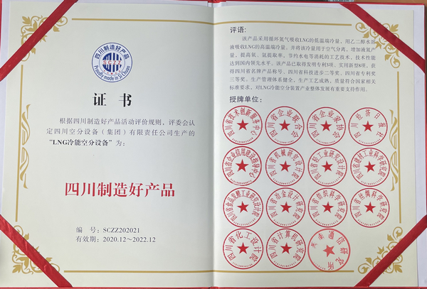 根據(jù)四川制造好產品活動評價規(guī)則,我公司生產的“LNG冷能空分設備”被評為“四川制造好產品”。目前該產品已取得發(fā)明專利3項、實用新型專利8項,獲得了四川省名牌產品稱號、四川省科技進步二等獎、四川省專利獎三等獎等榮譽。