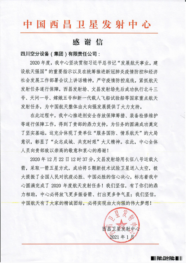 這是用戶,也是國(guó)家對(duì)我們的肯定!今后,四川空分集團(tuán)將繼續(xù)發(fā)揚(yáng)公司“團(tuán)結(jié)誠(chéng)信、決戰(zhàn)決勝”的企業(yè)文化精神,一如既往地以優(yōu)質(zhì)的產(chǎn)品、高效的服務(wù),為中國(guó)航天整體由大向強(qiáng)的發(fā)展,為中華民族偉大復(fù)興中國(guó)夢(mèng)的實(shí)現(xiàn)繼續(xù)作出川空貢獻(xiàn)!