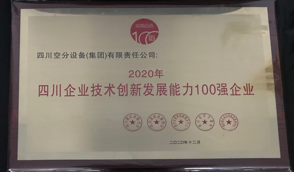 近日,我公司榮獲2020年“四川企業(yè)技術(shù)創(chuàng)新發(fā)展能力100強企業(yè)”榮譽,這是客戶、行業(yè)和社會對我們的肯定,也是激勵,更是責(zé)任!未來,四川空分集團要繼續(xù)守初心,擔(dān)使命,大力推進技術(shù)開發(fā)與自主創(chuàng)新,為把我國建成社會主義現(xiàn)代化強國作出川空新的更大的貢獻!