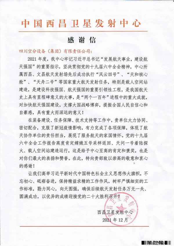 近日,我公司再次收到中國西昌衛(wèi)星發(fā)射中心發(fā)來的感謝信。發(fā)射中心對我公司在“風(fēng)云四號(hào)”、“天和核心艙”、“天舟二號(hào)”等國家重大航天發(fā)射任務(wù),特別是載人空間站建造中提供的裝備建造、任務(wù)保障、技術(shù)支持等工作服務(wù)表示最衷心地感謝。