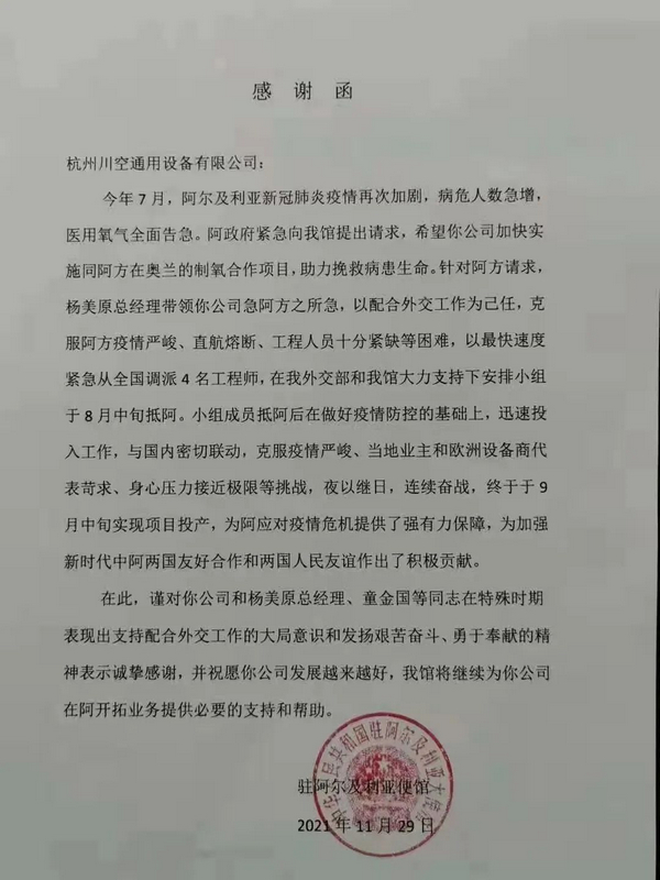 2021年11月29日,中國駐阿爾及利亞大使館給我公司杭州川空發(fā)來感謝信,對(duì)杭州川空在新冠疫情十分嚴(yán)峻的情況下,克服困難支持阿方推動(dòng)液體空分的投產(chǎn),助力挽救病患生命所作出的努力表示感謝,對(duì)杭州川空楊美原總經(jīng)理以及童金國等同志在特殊時(shí)期支持和配合外交工作的大局意識(shí)和發(fā)揚(yáng)艱苦奮斗、勇于奉獻(xiàn)的精神表示感謝。