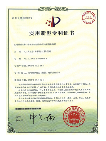 實用新型專利證書-帶輔助精餾塔的低純氧制取裝置