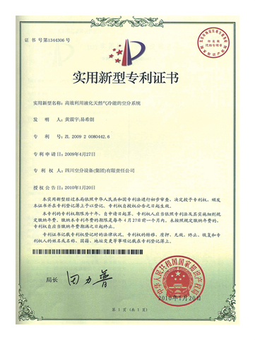 實用新型專利證書-高效利用液化天然氣冷能的空分系統(tǒng)