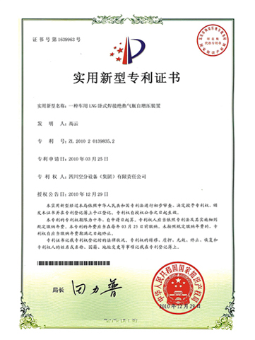 實用新型專利證書-一種車用LNG臥式焊接絕熱氣瓶自增壓裝置