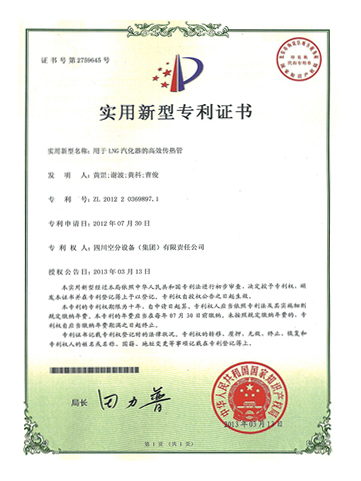 實用新型專利證書-用于LNG汽化器的高效傳熱管