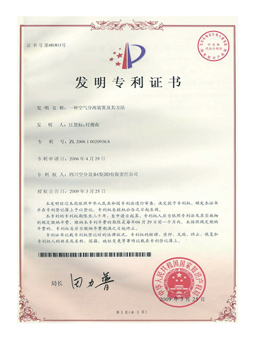 發(fā)明專利證書-一種空氣分離制取壓力氧氣的方法及裝置