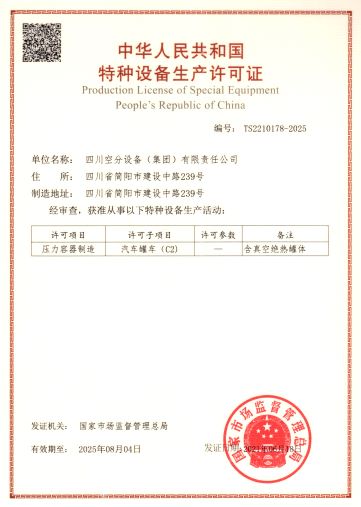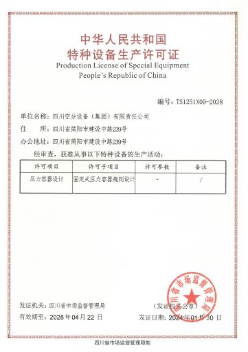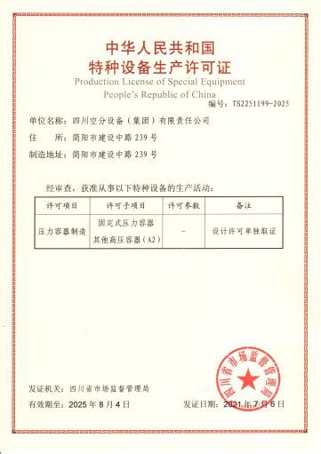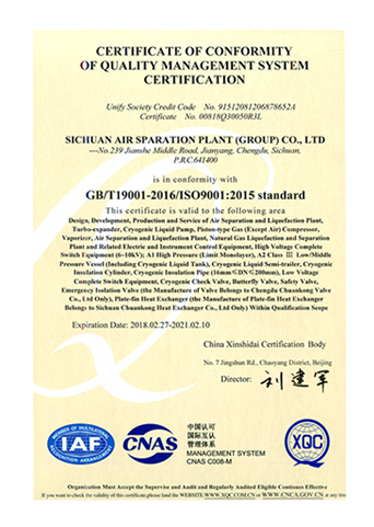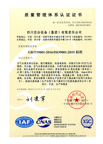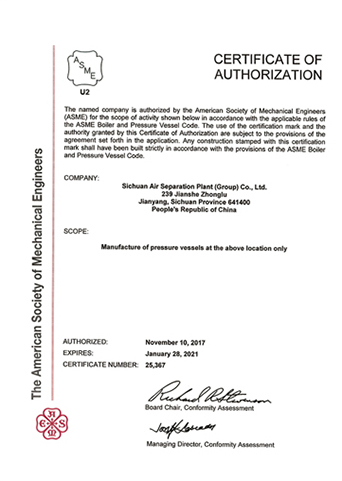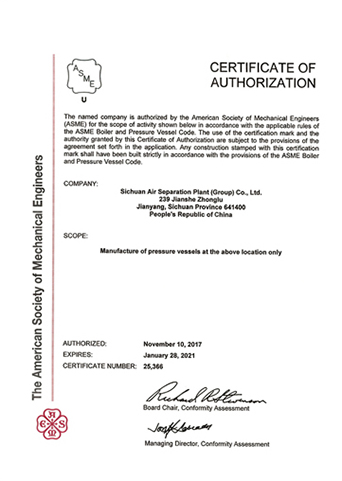 公司在推行全面質(zhì)量管理的基礎(chǔ)上,通過各種專業(yè)認(rèn)證,進(jìn)一步提高了公司質(zhì)量管理水平和質(zhì)量保證能力。公司早在1987年就取得三類(A級(jí))壓力容器設(shè)計(jì)、制造資格,順利通過了國(guó)家主管部門組織的歷次換證評(píng)審,目前公司已具有A1、A2、C2級(jí)壓力容器設(shè)計(jì)資格,GC1級(jí)壓力管道設(shè)計(jì)資格,A2、B3、C2級(jí)壓力容器制造資格。全面覆蓋公司所設(shè)計(jì)、制造的壓力容器、壓力管道及元件種類。公司于1990年取得美國(guó)機(jī)械工程師協(xié)會(huì)頒發(fā)的ASME授權(quán)證書及U、U2鋼印,并順利通過歷次換證檢查;公司于1996年取得中國(guó)機(jī)械工業(yè)認(rèn)證中心頒發(fā)的GB/T19001質(zhì)量管理體系認(rèn)證證書并順利通過歷次換證審核;2003年,公司的低溫液體運(yùn)輸車、半掛車首批取得國(guó)家3C強(qiáng)制認(rèn)證。公司出口的成套空分設(shè)備和天然氣液化設(shè)備通過了歐盟CE認(rèn)證。