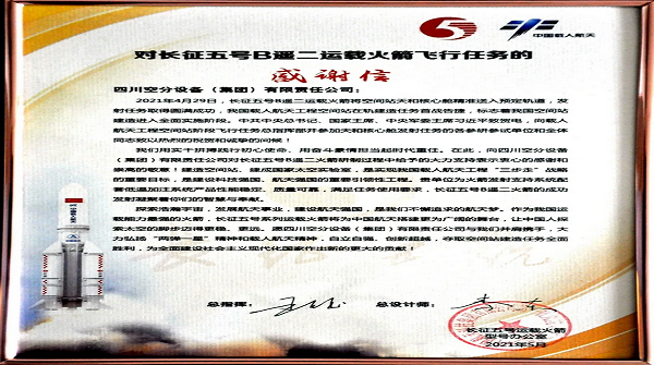長征五號運載火箭型號辦公室給我公司發(fā)來感謝信