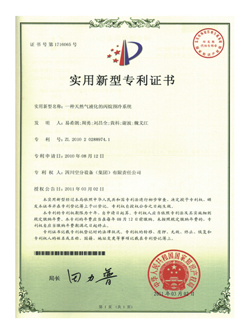 實(shí)用新型專利證書-一種天然氣液化的丙烷預(yù)冷系統(tǒng)